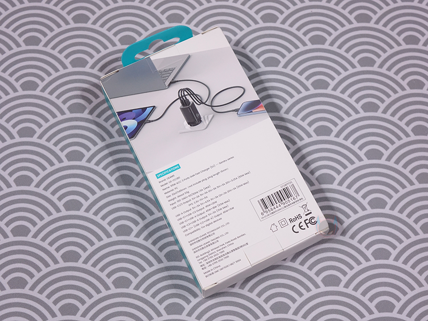 유삼스(USAMS)의 액세서리 제품군들은 대부분 박스까지 밀봉처리하는 경우가 많습니다. 고속충전기 제품도 액세서리군에 속하기때문에 65W 고속충전기 US-CC180도 박스 전체까지 밀봉처리되어 있죠. 소비자입장에선 판매제품에 신뢰를 가질 수 있는 처리라 할 수 있습니다. 그리고, 뒤에서 다시 언급하겠지만, 박스 전면에는 제품 이미지를 담고 있는데, US-CC180 충전기는 총 4가지 색상으로 나와서 각 색상별로 제품박스에 적용하고 있습니다.
