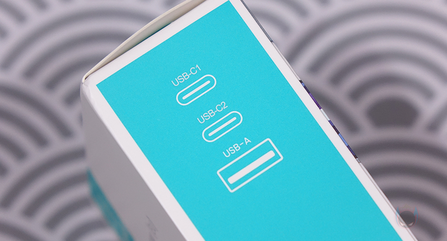 박스 전면에는 제품 이미지 외에도 3포트 GaN(질화갈륨) 고속충전기라는 문구를 표기해놨는데, 대부분 65W이상부터는 GaN 방식을 적용하고 있습니다. 그리고, 제품 이미지 측면에도 65W 고속출력, PD 충전, QC 충전 지원 등을 주요 특징으로 표기해놨으며, 박스 측면에는 USB 포트 구성을 표기해놨죠. 방금 언급했듯이 65W 고속충전기 US-CC180은 USB Type-C 2개, Type-A 1개로 3포트 구성하고 있습니다.